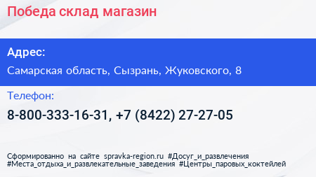 Победа, склад-магазин по адресу Самарская область, Сызрань, Жуковского, 8 в дальнейшем Организация, размещена в следующих категориях: