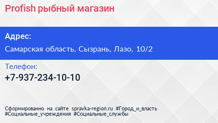 Profish, рыбный магазин по адресу Самарская область, Сызрань, Лазо, 10/2 в дальнейшем Организация, размещена в следующих категориях: