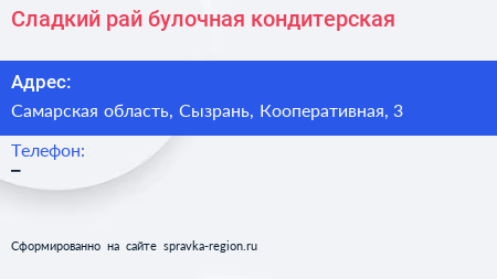 Сладкий рай, булочная-кондитерская по адресу Самарская область, Сызрань, Кооперативная, 3 в дальнейшем Организация, размещена в следующих категориях: