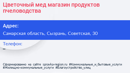 Цветочный мед, магазин продуктов пчеловодства по адресу Самарская область, Сызрань, Советская, 30 в дальнейшем Организация, размещена в следующих категориях: