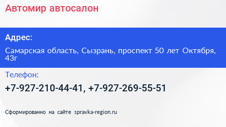 Автомир, автосалон по адресу Самарская область, Сызрань, проспект 50 лет Октября, 43г в дальнейшем Организация, размещена в следующих категориях:
