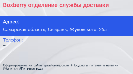 Boxberry, отделение службы доставки по адресу Самарская область, Сызрань, Жуковского, 25а в дальнейшем Организация, размещена в следующих категориях: