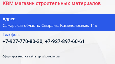 КВМ, магазин строительных материалов по адресу Самарская область, Сызрань, Каменоломная, 14в в дальнейшем Организация, размещена в следующих категориях: