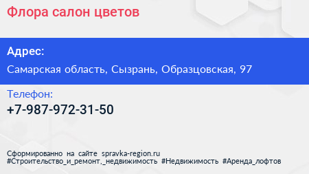 Флора, салон цветов по адресу Самарская область, Сызрань, Образцовская, 97 в дальнейшем Организация, размещена в следующих категориях: