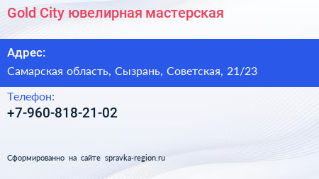 Gold Сity, ювелирная мастерская по адресу Самарская область, Сызрань, Советская, 21/23 в дальнейшем Организация, размещена в следующих категориях: