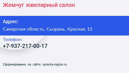 Жемчуг, ювелирный салон по адресу Самарская область, Сызрань, Красная, 12 в дальнейшем Организация, размещена в следующих категориях: