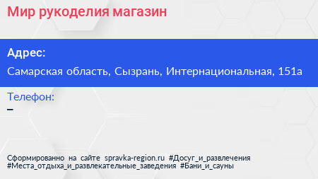 Мир рукоделия, магазин по адресу Самарская область, Сызрань, Интернациональная, 151а в дальнейшем Организация, размещена в следующих категориях: