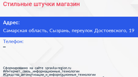 Стильные штучки, магазин по адресу Самарская область, Сызрань, переулок Достоевского, 19 в дальнейшем Организация, размещена в следующих категориях: