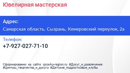 Ювелирная мастерская по адресу Самарская область, Сызрань, Кемеровский переулок, 2а в дальнейшем Организация, размещена в следующих категориях: