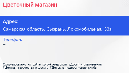 Цветочный магазин по адресу Самарская область, Сызрань, Локомобильная, 33а в дальнейшем Организация, размещена в следующих категориях: