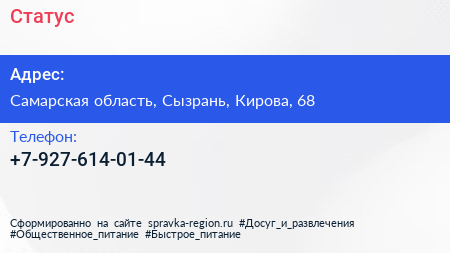 Статус по адресу Самарская область, Сызрань, Кирова, 68 в дальнейшем Организация, размещена в следующих категориях: