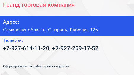 Гранд, торговая компания по адресу Самарская область, Сызрань, Рабочая, 125 в дальнейшем Организация, размещена в следующих категориях: