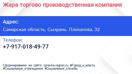 Жара, торгово-производственная компания по адресу Самарская область, Сызрань, Плеханова, 32 в дальнейшем Организация, размещена в следующих категориях: