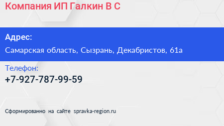 Компания, ИП Галкин В.С. по адресу Самарская область, Сызрань, Декабристов, 61а в дальнейшем Организация, размещена в следующих категориях: