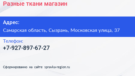 Разные ткани, магазин по адресу Самарская область, Сызрань, Московская улица, 37 в дальнейшем Организация, размещена в следующих категориях: