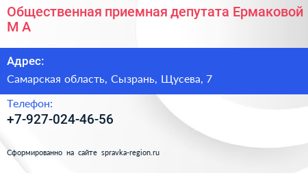Общественная приемная депутата Ермаковой М.А. по адресу Самарская область, Сызрань, Щусева, 7 в дальнейшем Организация, размещена в следующих категориях: