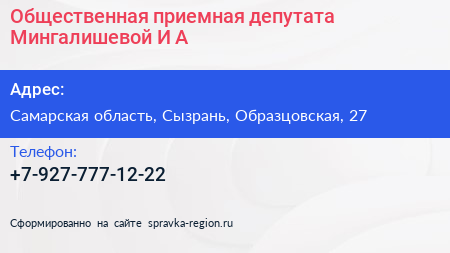 Общественная приемная депутата Мингалишевой И.А. по адресу Самарская область, Сызрань, Образцовская, 27 в дальнейшем Организация, размещена в следующих категориях: