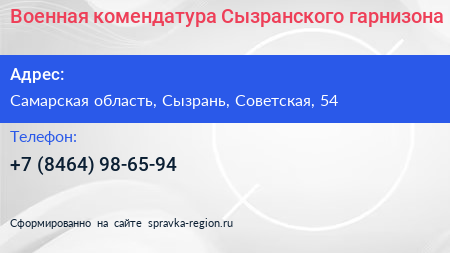 Военная комендатура Сызранского гарнизона по адресу Самарская область, Сызрань, Советская, 54 в дальнейшем Организация, размещена в следующих категориях: