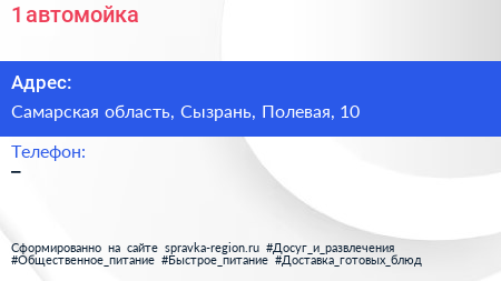 №1, автомойка по адресу Самарская область, Сызрань, Полевая, 10 в дальнейшем Организация, размещена в следующих категориях: