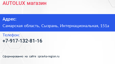 AUTOLUX, магазин по адресу Самарская область, Сызрань, Интернациональная, 151а в дальнейшем Организация, размещена в следующих категориях: