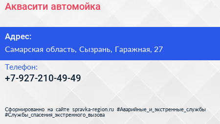 Аквасити, автомойка по адресу Самарская область, Сызрань, Гаражная, 27 в дальнейшем Организация, размещена в следующих категориях: