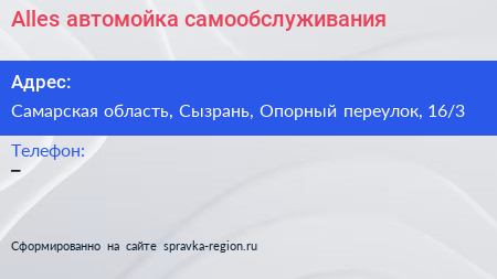 Alles, автомойка самообслуживания по адресу Самарская область, Сызрань, Опорный переулок, 16/3 в дальнейшем Организация, размещена в следующих категориях: