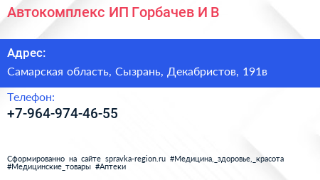 Автокомплекс, ИП Горбачев И.В. по адресу Самарская область, Сызрань, Декабристов, 191в в дальнейшем Организация, размещена в следующих категориях: