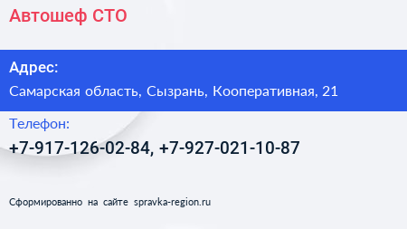 Автошеф, СТО по адресу Самарская область, Сызрань, Кооперативная, 21 в дальнейшем Организация, размещена в следующих категориях: