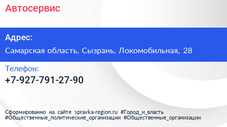Автосервис по адресу Самарская область, Сызрань, Локомобильная, 28 в дальнейшем Организация, размещена в следующих категориях: