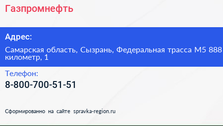 Газпромнефть по адресу Самарская область, Сызрань, Федеральная трасса М5 888 километр, 1 в дальнейшем Организация, размещена в следующих категориях: