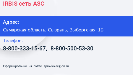 IRBIS, сеть АЗС по адресу Самарская область, Сызрань, Выборгская, 1Б в дальнейшем Организация, размещена в следующих категориях: