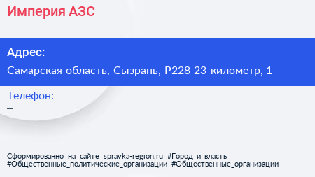 Империя, АЗС по адресу Самарская область, Сызрань, Р228 23 километр, 1 в дальнейшем Организация, размещена в следующих категориях: