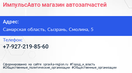 ИмпульсАвто, магазин автозапчастей по адресу Самарская область, Сызрань, Смолина, 5 в дальнейшем Организация, размещена в следующих категориях: