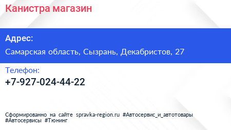 Канистра, магазин по адресу Самарская область, Сызрань, Декабристов, 27 в дальнейшем Организация, размещена в следующих категориях: