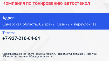 Компания по тонированию автостекол по адресу Самарская область, Сызрань, Свайный переулок, 1а в дальнейшем Организация, размещена в следующих категориях: