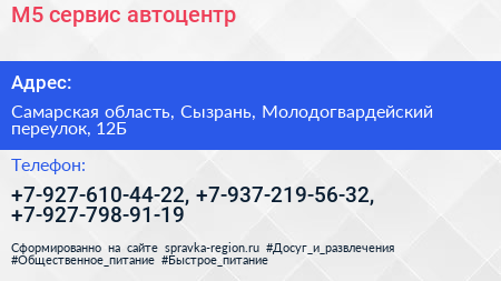 М5-сервис, автоцентр по адресу Самарская область, Сызрань, Молодогвардейский переулок, 12Б в дальнейшем Организация, размещена в следующих категориях:
