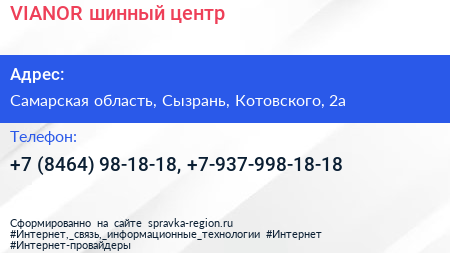 VIANOR, шинный центр по адресу Самарская область, Сызрань, Котовского, 2а в дальнейшем Организация, размещена в следующих категориях: