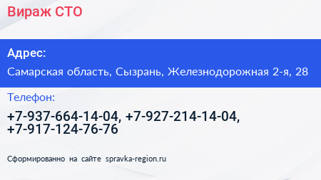 Вираж, СТО по адресу Самарская область, Сызрань, Железнодорожная 2-я, 28 в дальнейшем Организация, размещена в следующих категориях: