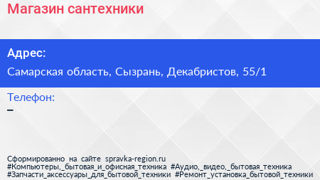 Магазин сантехники по адресу Самарская область, Сызрань, Декабристов, 55/1 в дальнейшем Организация, размещена в следующих категориях: