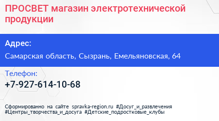 ПРОСВЕТ, магазин электротехнической продукции по адресу Самарская область, Сызрань, Емельяновская, 64 в дальнейшем Организация, размещена в следующих категориях: