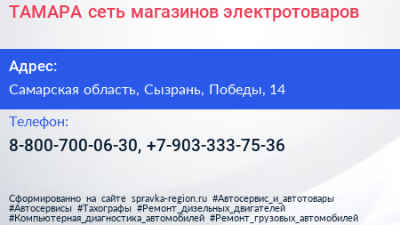 ТАМАРА, сеть магазинов электротоваров по адресу Самарская область, Сызрань, Победы, 14 в дальнейшем Организация, размещена в следующих категориях: