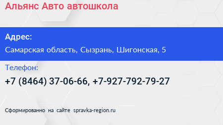 Альянс-Авто, автошкола по адресу Самарская область, Сызрань, Шигонская, 5 в дальнейшем Организация, размещена в следующих категориях:
