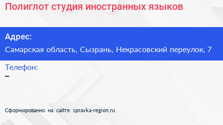 Полиглот, студия иностранных языков по адресу Самарская область, Сызрань, Некрасовский переулок, 7 в дальнейшем Организация, размещена в следующих категориях: