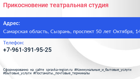 Прикосновение, театральная студия по адресу Самарская область, Сызрань, проспект 50 лет Октября, 14 в дальнейшем Организация, размещена в следующих категориях: