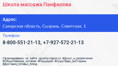 Школа массажа Панфилова по адресу Самарская область, Сызрань, Советская, 1 в дальнейшем Организация, размещена в следующих категориях: