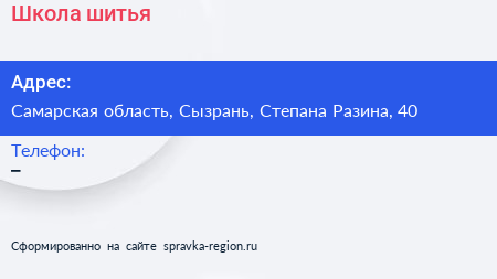 Школа шитья по адресу Самарская область, Сызрань, Степана Разина, 40 в дальнейшем Организация, размещена в следующих категориях: