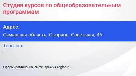 Студия курсов по общеобразовательным программам по адресу Самарская область, Сызрань, Советская, 45 в дальнейшем Организация, размещена в следующих категориях: