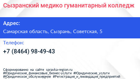Сызранский медико-гуманитарный колледж по адресу Самарская область, Сызрань, Советская, 5 в дальнейшем Организация, размещена в следующих категориях: