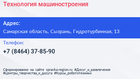 Технология машиностроения по адресу Самарская область, Сызрань, Гидротурбинная, 13 в дальнейшем Организация, размещена в следующих категориях:
