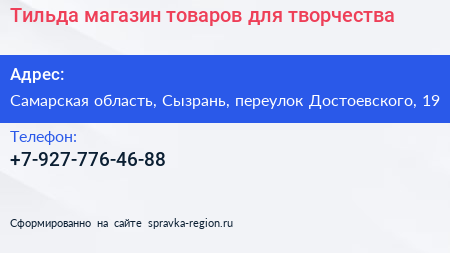 Тильда, магазин товаров для творчества по адресу Самарская область, Сызрань, переулок Достоевского, 19 в дальнейшем Организация, размещена в следующих категориях:
